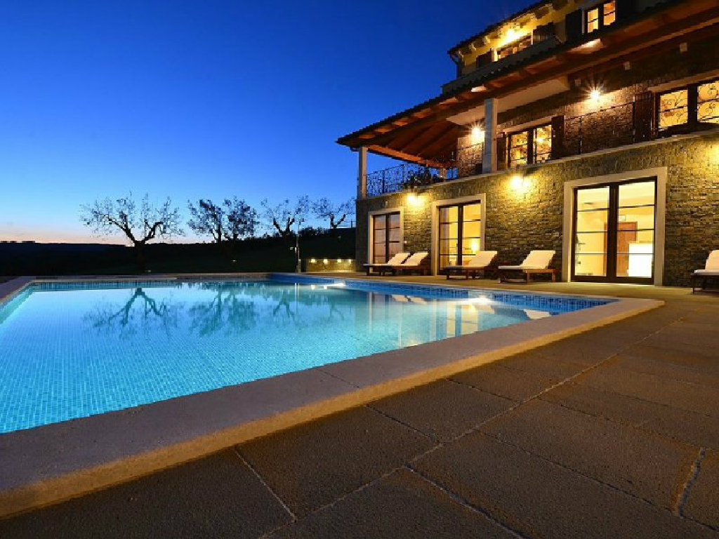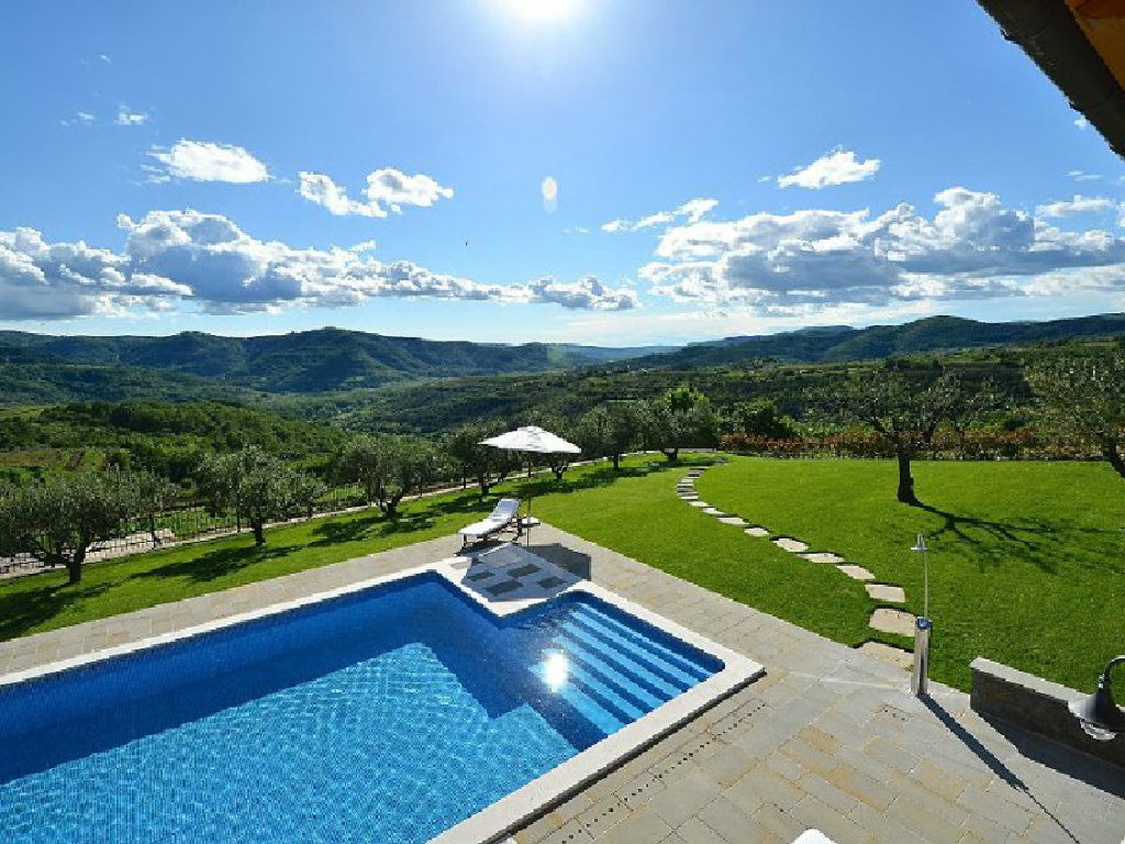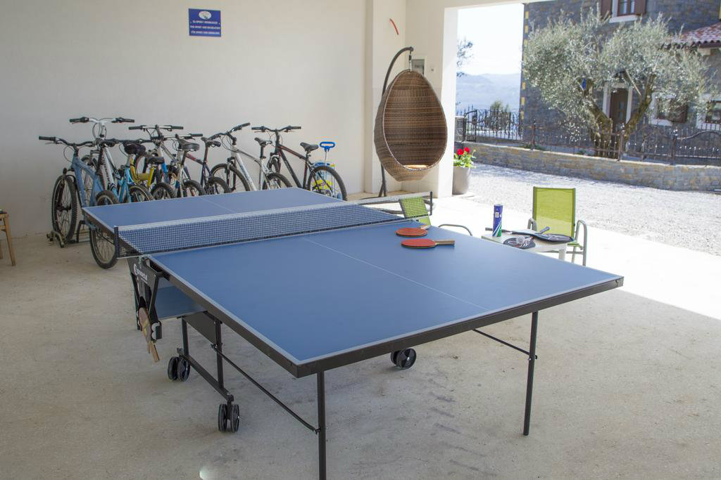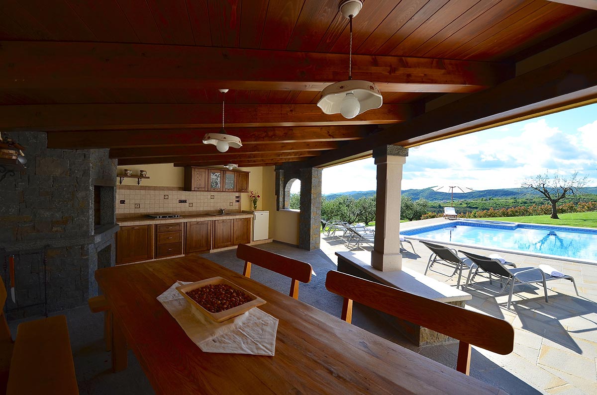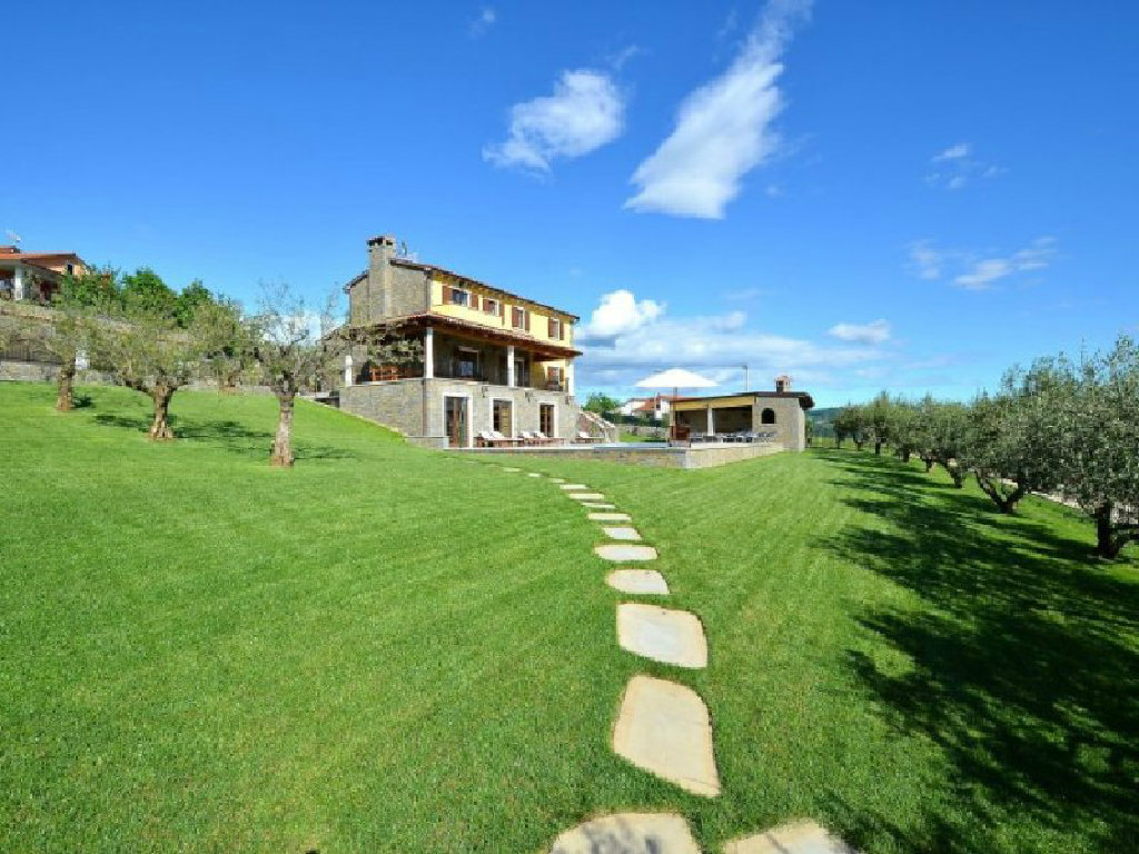 Poželite li osvježenje u toplim ljetnim mjesecima, tu je i vrtni bazen površine pedeset kvadratnih metara s mogučnošću grijanja te s hidromasažnim pumpama. Sunčeve zrake možete hvatati na jednoj od dvanaest ležaljki, a poželite li manje osunčano mjesto, pobjegnite u hladovinu jedne od maslina. Dok bezbrižno uživate u pogledu na jezero i okolne stoljetne šume vaši najmlađi će se zabavljati na klackalici ili ljuljački. Na raspolaganju su vam i četiri bicikla. U vrtu se nalazi i natkrivena kuhinja opremljena kaminom, kuhalom na plin, sudoperom, frižiderom i stolom za dvanaest osoba. Ovdje gosti mogu kušati istarske specijalitete koje će pripremiti sami ili, pak, pod stručnim vodstvom.